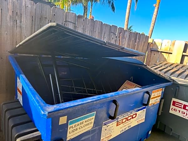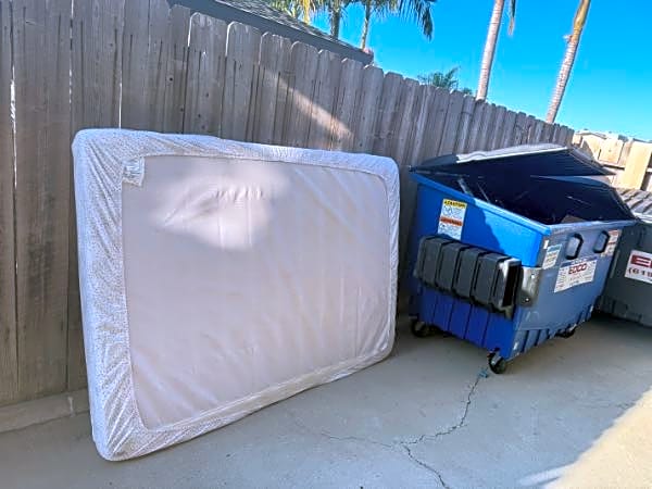 Someone did not properly dispose of large mattress and bed frame into the dumpster by fully not breaking them down before placing them into the container.