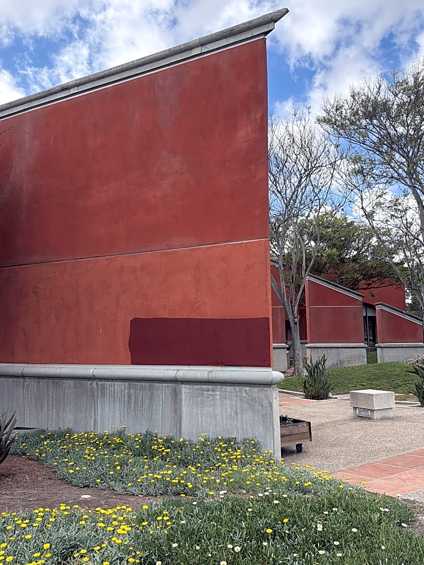 13330 Salmon River RdThis is the front of the Rancho Peñasquitos Library. Presumably the dark patch was to cover graffiti. No effort was made to match the paint—it wasn’t even taped off to make the patch an even triangle. The building’s exterior is literally falling apart, which presumably can’t be addressed due to budgetary constraints, but it would have cost nothing extra to paint this properly. This once-beautiful library has become an embarrassing eyesore.