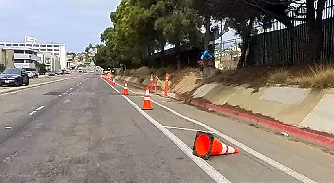 Unacceptable to close a bike lane on a road where cars drive 45+mph without a safe detour. In violation of both CA Vehicle Code 21211.b and the city's own "Whitebook" manual section 601-5(2)(b) which stipulates that if a bike lane must be closed, a detour bike path must be provided. Please create one out of temp jersey barriers in 1 of 2 remaining driving lanes. Extremely dangerous, huge liability.