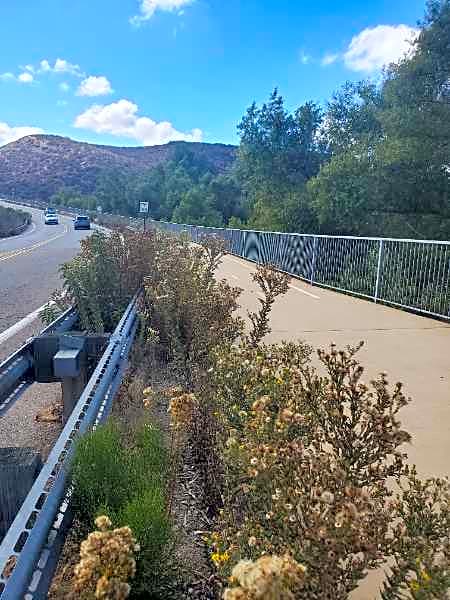 Flowers are leaning over blocking line of site in bike lane from the pedestrian bridge west to fisherman's trail entrance.