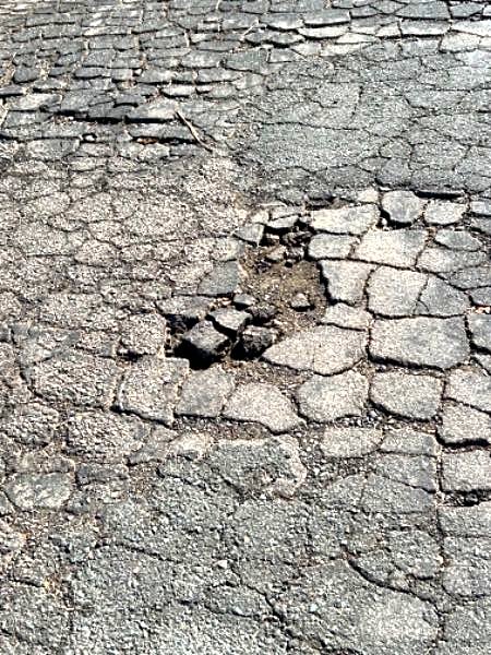 Pot holes || LOCATION: Between the end of cul de sac and the cross street of Iroquois Way / Iroquois Ave || LANE: Middle of the street || DIRECTION: Unknown