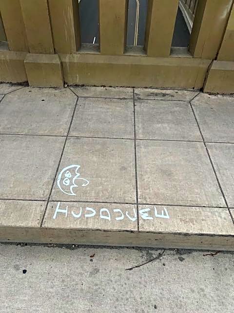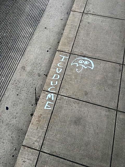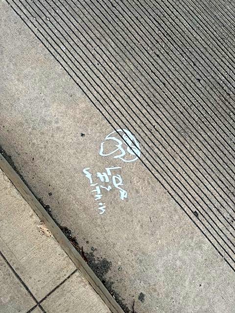 On the bridge above University Ave. on Georgia Street, there are multiple white graffiti tags on the sidewalk and road.