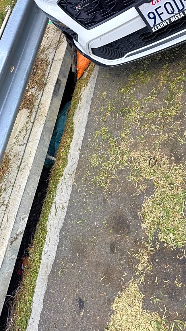 3000–3098 Fourth AveThere is a large teal and white comforter pillow or duvet in the storm drain on fourth Avenue at Redwood. I pulled out quite a bit of Styrofoam hatching tape and other construction debris, but I could not pull out this pillow that may block the new storm drain in the next storm