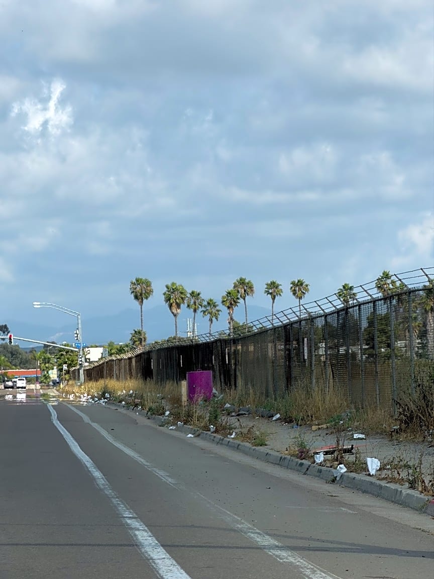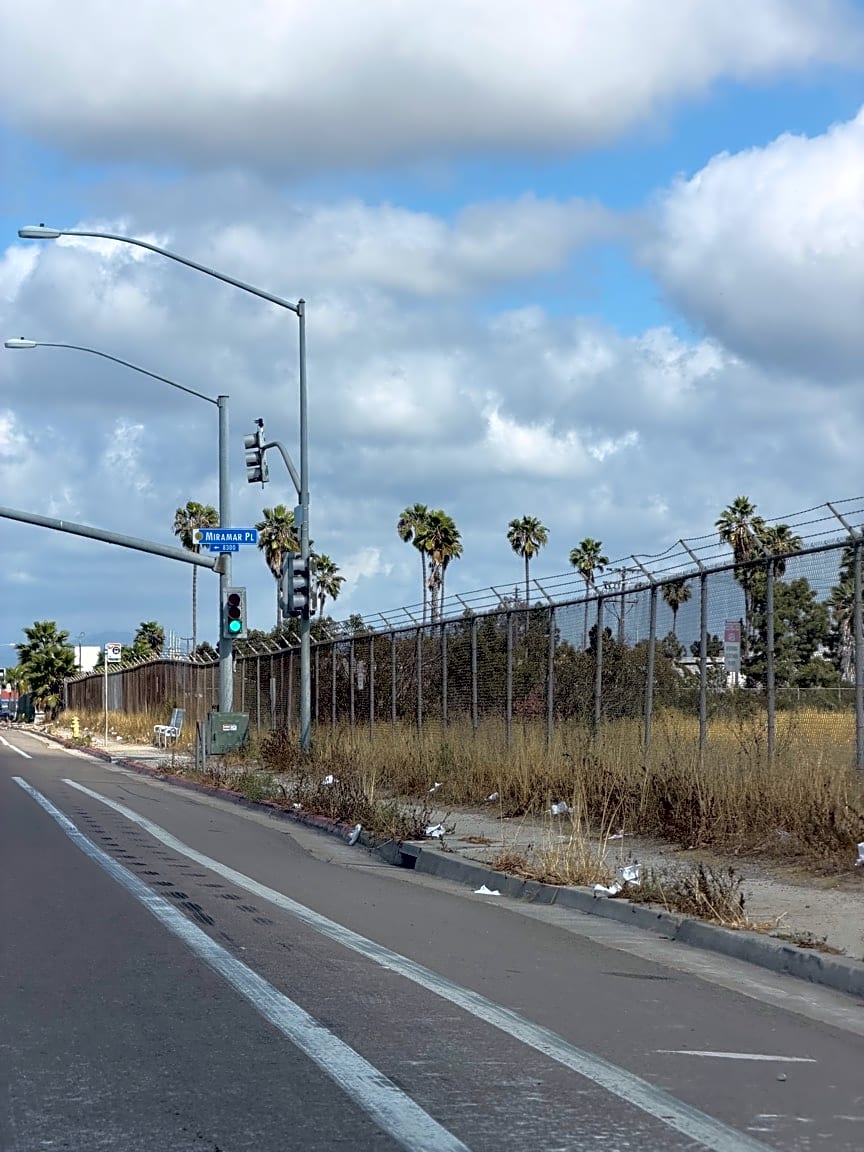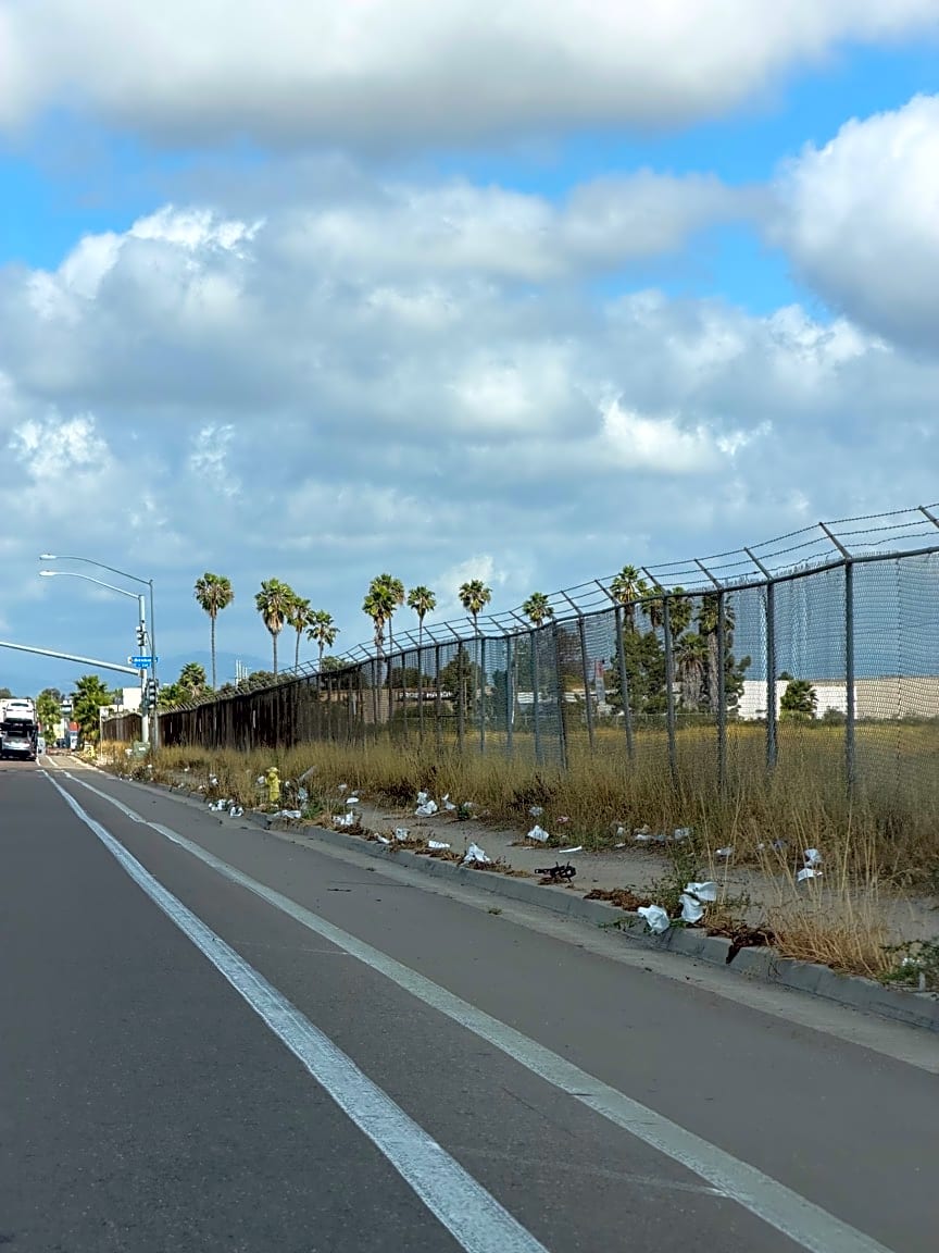 Miramar RdTrash spilled along Miramar Rd between Eastgate Mall & Miramar Pl. Also bunch of weeds and rocks covering ADA sidewalks and ramps for over a year